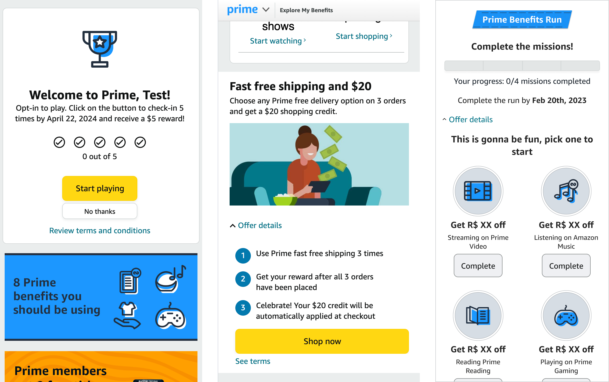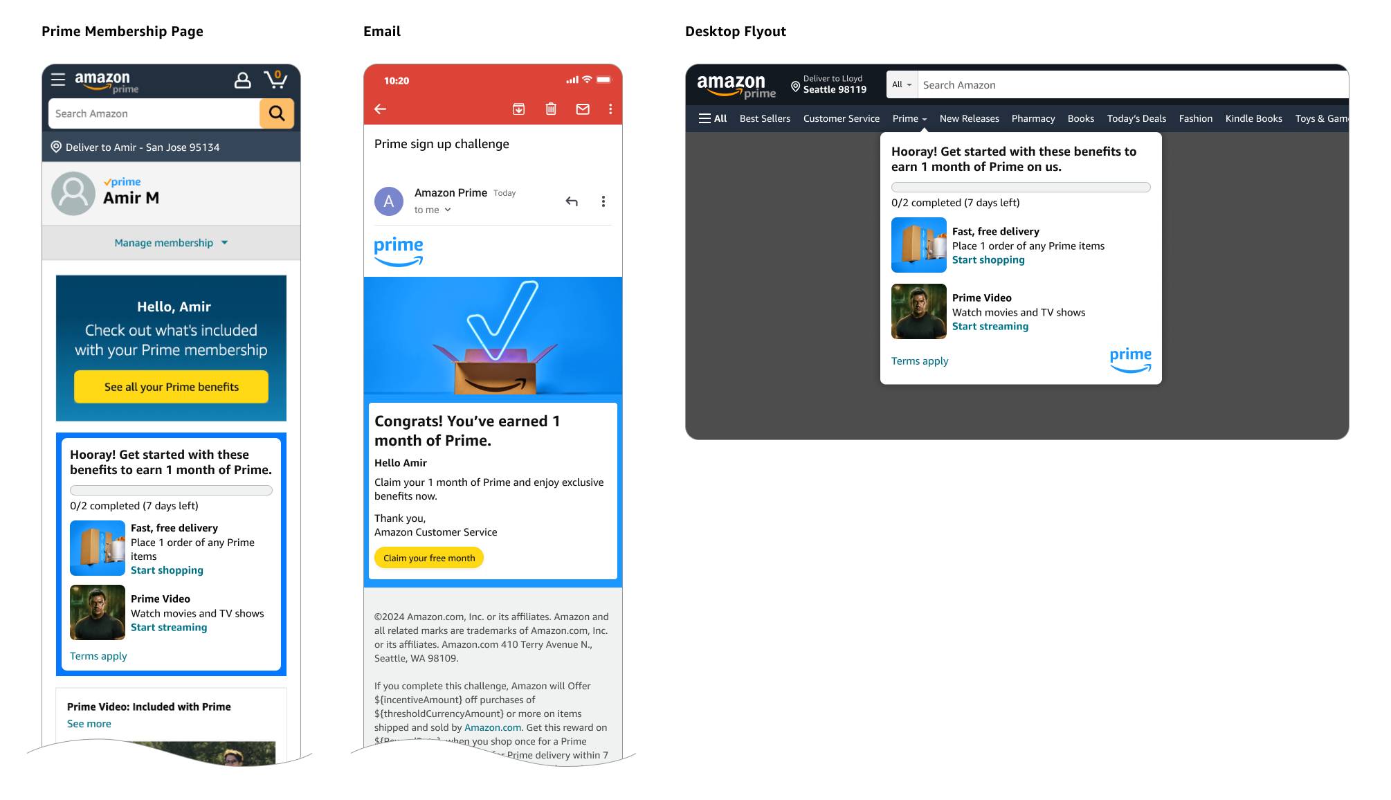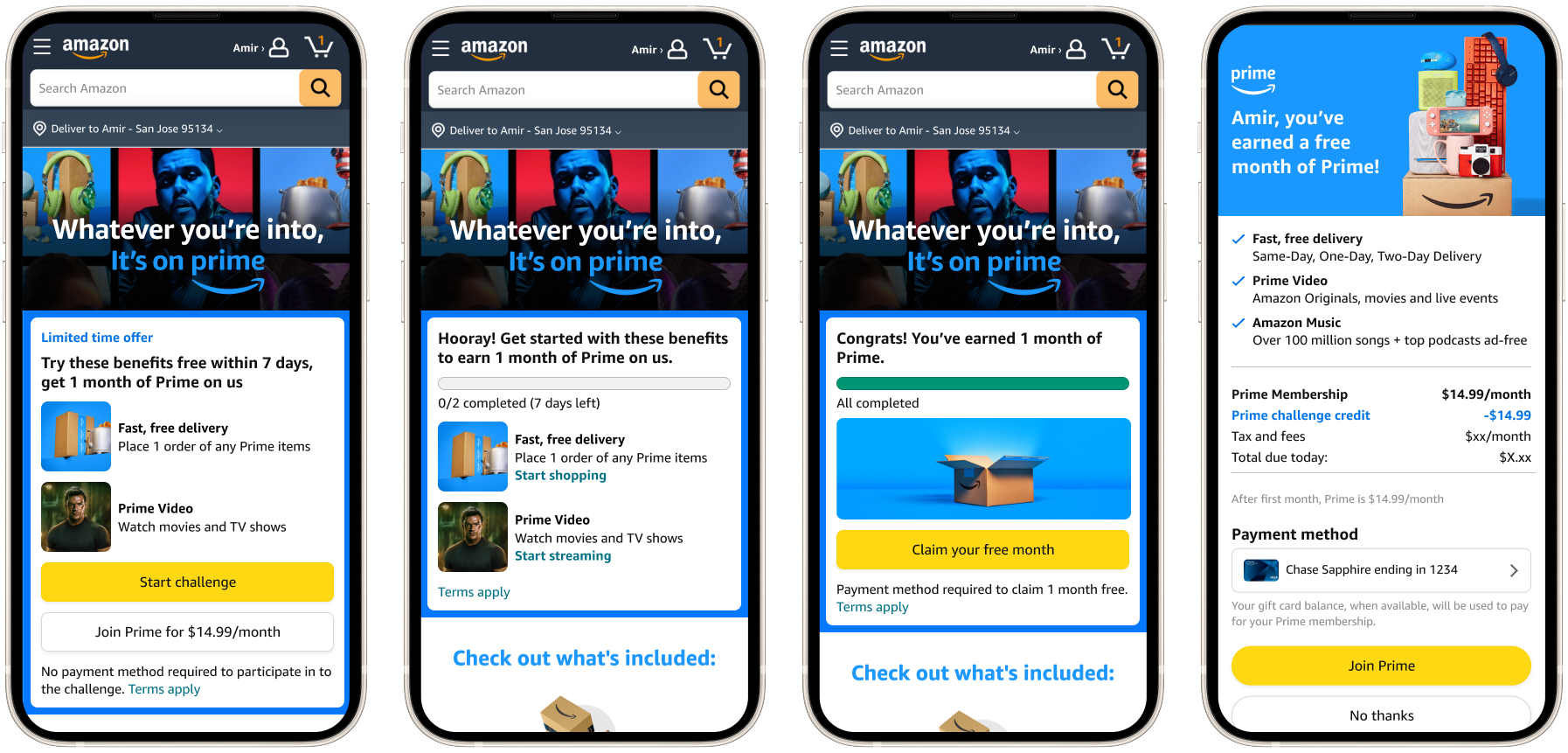 Prime members strongly value fast shipping, but many additional benefits remain under-discovered after sign-up. I led the design of a gamification framework that introduced challenges, rewards, and personalized motivation directly into existing Prime journeys.