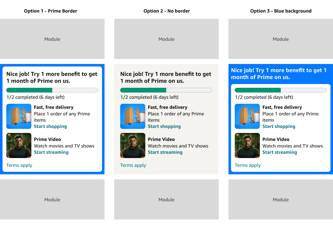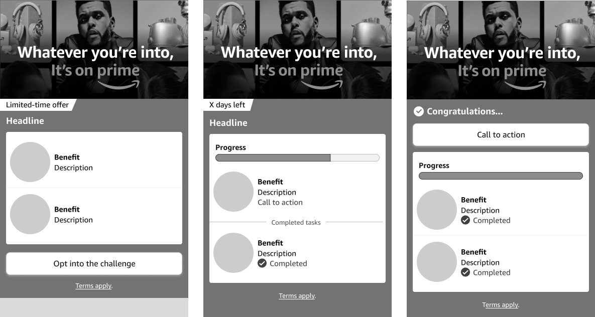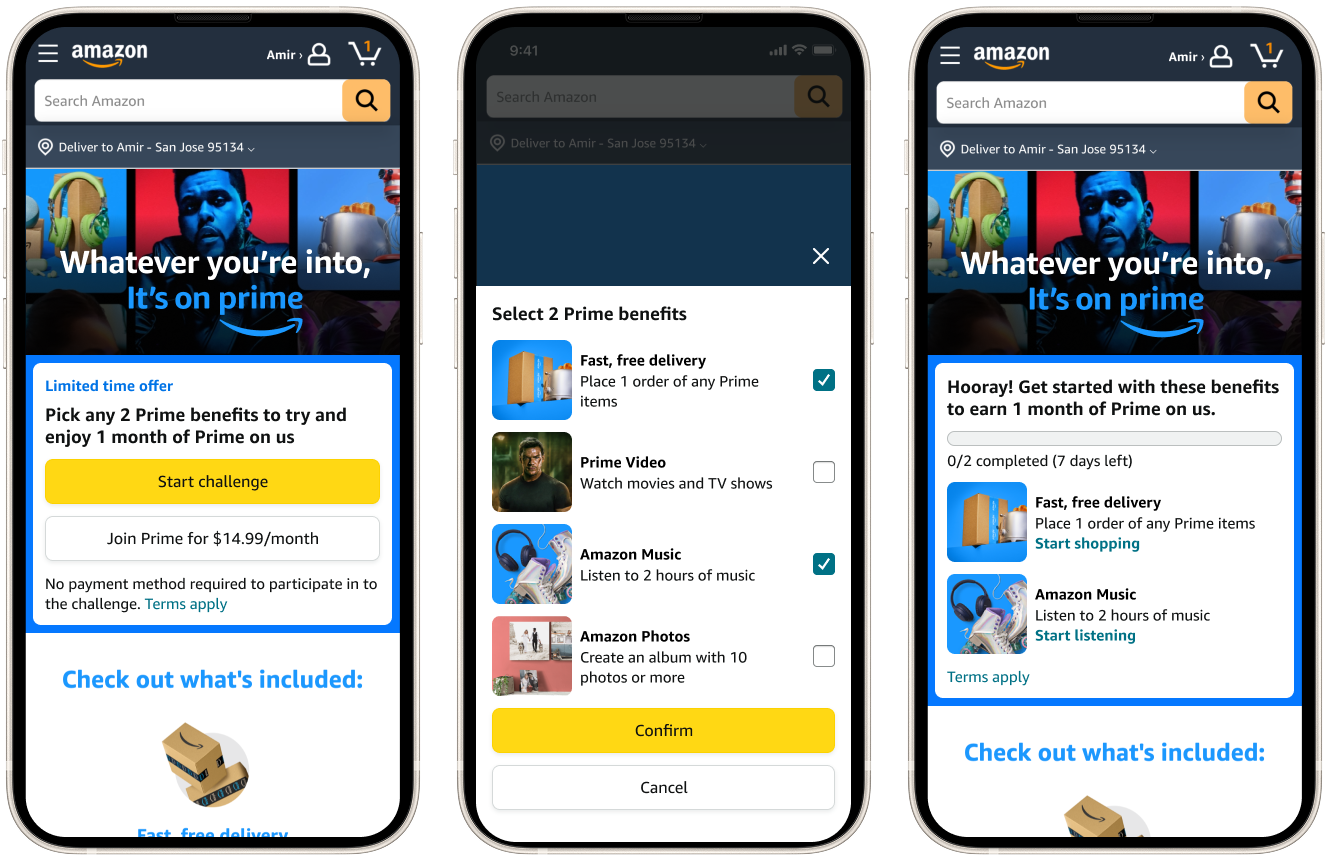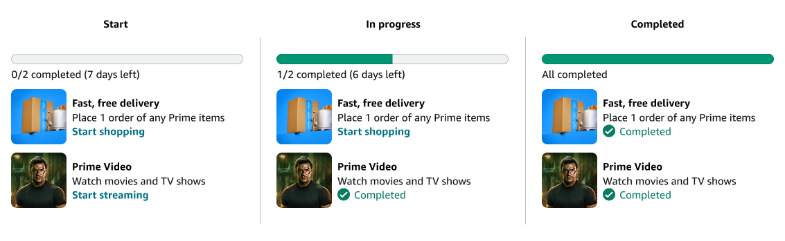 Prime members strongly value fast shipping, but many additional benefits remain under-discovered after sign-up. I led the design of a gamification framework that introduced challenges, rewards, and personalized motivation directly into existing Prime journeys.